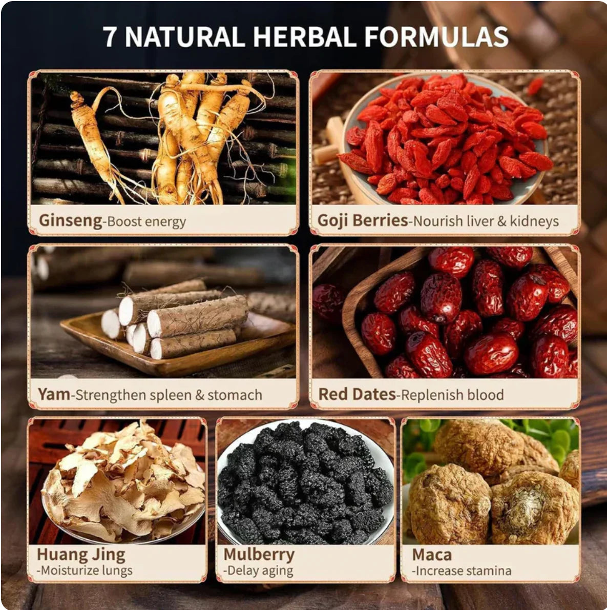 Our tea includes ginseng, goji berries, red dates, mulberry, maca, yam, and huang jing—carefully dried and blended without any artificial ingredients or additives. Each ingredient was chosen for its health benefits, helping you feel your best from the inside out.