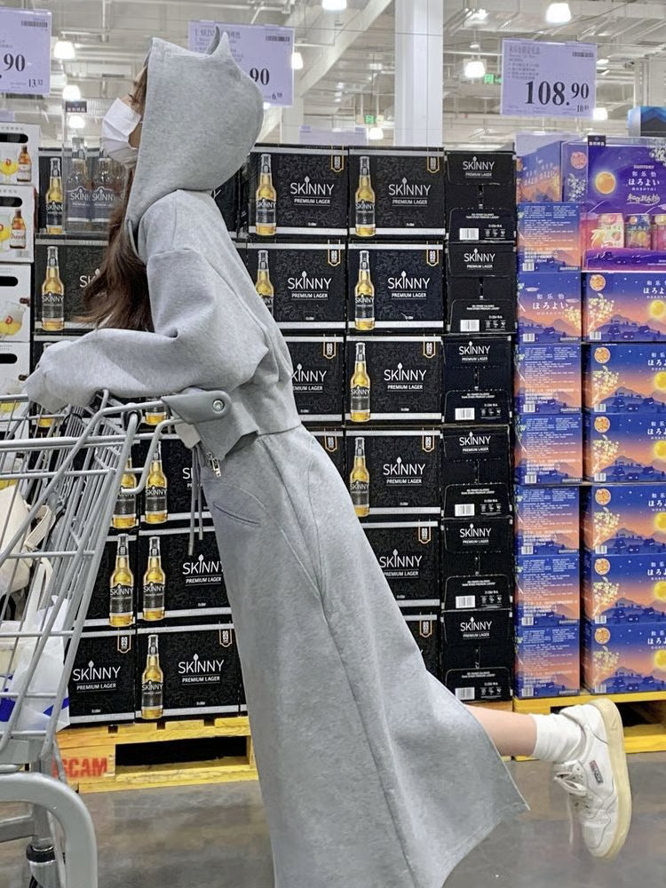 Gray sports suit with elegant hooded sweatshirt and slimming slit skirt suit